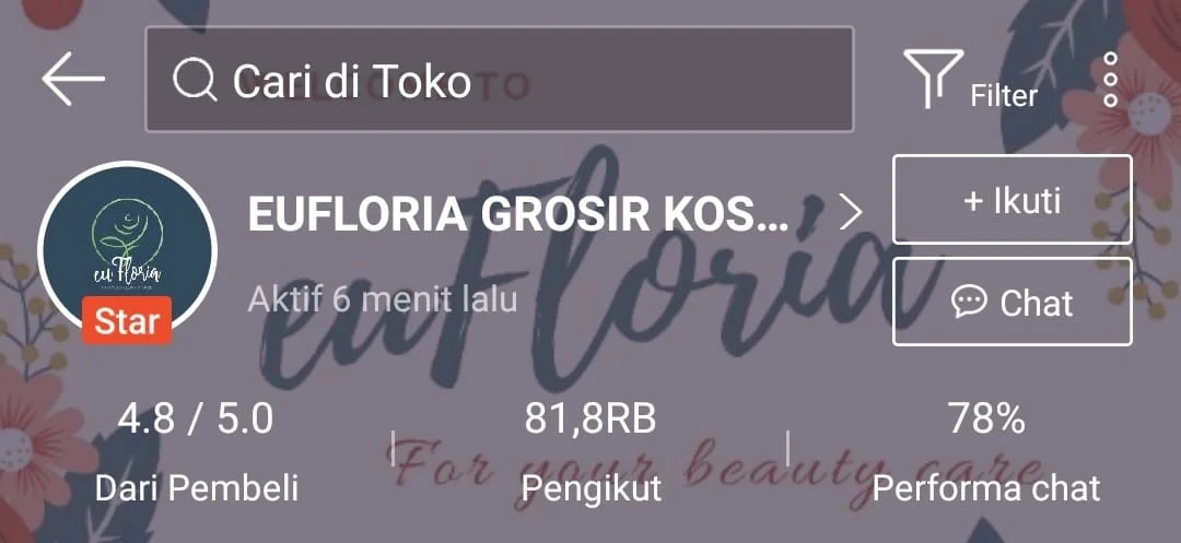 Eufloria Grosir Kosmetik adalah penjual Star Seller di Shopee dan beralamat di Medan, Sumatera Utara.